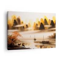 Canvastavla - Bild på duk - Ett orientaliskt landskap med en flod, berg och en mild dimma. - 70x50cm - Längre bort än Fjärran Östern - Modern väggdekoration för vardagsrum och sovrum ARTTOR