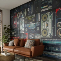 Fototapet Premium Sand - Längtan efter 80-talet - Bandspelare, Musikförstärkare, Vintage musikalisk utrustning - 100x70 cm