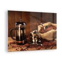 Glastavla - Bild på glas - Kaffebryggare, koppar och en påse kaffebönor - 70x50cm - Kaffets charm - arom och smak - Modern väggdekoration för vardagsrum och sovrum ARTTOR