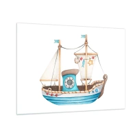 Glastavla - Bild på glas - Illustration av ett barns skepp på vit bakgrund - 70x50cm - Ohoj, äventyret! - Modern väggdekoration för vardagsrum och sovrum ARTTOR