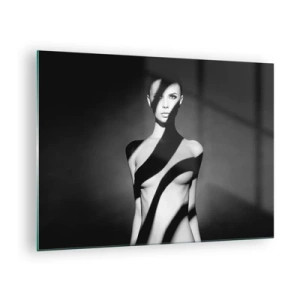 Glastavla - Bild på glas - Svartvitt porträtt av en kvinna med slående skuggor - 70x50cm - I skenet och i skuggan - Modern väggdekoration för vardagsrum och sovrum ARTTOR