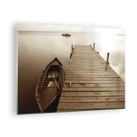 Glastavla - Bild på glas - En båt vid en pir på en lugn sjö i sepia - 70x50cm - Stora lugnet - Modern väggdekoration för vardagsrum och sovrum ARTTOR