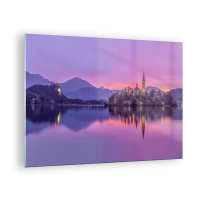 Glastavla - Bild på glas - En kyrka på en ö med berg och en solnedgång i bakgrunden - 70x50cm - Sagoön i solnedgången - Modern väggdekoration för vardagsrum och sovrum ARTTOR