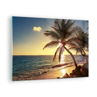 Glastavla - Bild på glas - Tropisk strand med palmer i ljuset av den nedgående solen - 70x50cm - Sommar under palmträden - Modern väggdekoration för vardagsrum och sovrum ARTTOR