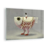 Glastavla - Bild på glas - En figur som rider på en rosa fisk med ben och en sadel - 70x50cm - Fiskryttare - Modern väggdekoration för vardagsrum och sovrum ARTTOR