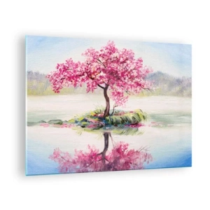 Glastavla - Bild på glas - Ett rosa träd på en ö som speglas i det lugna vattnet - 70x50cm - Vårens högtid - Modern väggdekoration för vardagsrum och sovrum ARTTOR