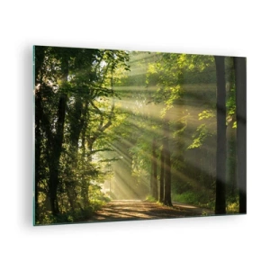 Glastavla - Bild på glas - En skogsstig upplyst av solens strålar - 70x50cm - En stund i skogen - Modern väggdekoration för vardagsrum och sovrum ARTTOR