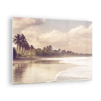 Glastavla - Bild på glas - En gyllene strand med palmer och ett lugnt hav i det mjuka ljuset - 70x50cm - Vågornas smekning - Modern väggdekoration för vardagsrum och sovrum ARTTOR