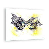 Glastavla - Bild på glas - Glasögon med konstnärliga mönster och ögon på en gultonad bakgrund - 70x50cm - Genom blåa glasögon - Modern väggdekoration för vardagsrum och sovrum ARTTOR