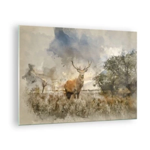 Glastavla - Bild på glas - En hjort i ett naturligt landskap med subtila färger i bakgrunden - 70x50cm - Värdighet - styrka - dignitet - Modern väggdekoration för vardagsrum och sovrum ARTTOR