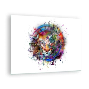 Glastavla - Bild på glas - Färgglatt porträtt av ett lejon i konstnärlig stil med abstrakta accenter - 70x50cm - Lurar bakom regnbågen - Modern väggdekoration för vardagsrum och sovrum ARTTOR