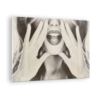 Glastavla - Bild på glas - En kvinna med läppstift på läpparna och händerna för ansiktet - 70x50cm - Jag kommer! - Modern väggdekoration för vardagsrum och sovrum ARTTOR