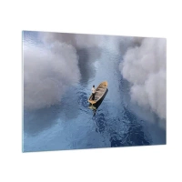 Glastavla - Bild på glas - En man i en båt som seglar genom vattnet bland molnen - 70x50cm - Livet - resan - det okända - Modern väggdekoration för vardagsrum och sovrum ARTTOR
