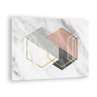 Glastavla - Bild på glas - Gyllene geometriska former på en marmorbakgrund - 70x50cm - Kedjekomposition - Modern väggdekoration för vardagsrum och sovrum ARTTOR
