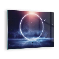 Glastavla - Bild på glas - En cirkel av ljus över sjön bland natthimlen och skogen - 70x50cm - De finns redan här... - Modern väggdekoration för vardagsrum och sovrum ARTTOR