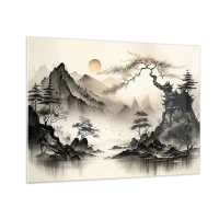 Glastavla - Bild på glas - Orientaliskt bergslandskap med en pagod och träd - 70x50cm - Orientens unika charm - Modern väggdekoration för vardagsrum och sovrum ARTTOR