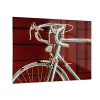 Glastavla - Bild på glas - En gammal racercykel från 1970-talet mot en röd trävägg - 70x50cm - Skapad för segrar - Modern väggdekoration för vardagsrum och sovrum ARTTOR