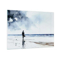 Glastavla - Bild på glas - Silhuett av en person på stranden i delikat akvarell - 70x50cm - Samtal med havet - Modern väggdekoration för vardagsrum och sovrum ARTTOR