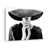 Glastavla - Bild på glas - Snygg kvinna i svart med hatt som täcker ansiktet - 70x50cm - Dold skönhet - Modern väggdekoration för vardagsrum och sovrum ARTTOR