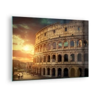 Glastavla - Bild på glas - Bro och basilika i Rom vid solnedgången - 70x50cm - Solnedgången över Den eviga staden - Modern väggdekoration för vardagsrum och sovrum ARTTOR