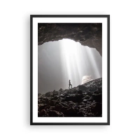 Affisch i svart ram - En figur i en grotta upplyst av ljusstrålar - 50x70cm - Ljusfylld grotta - Modern väggdekoration för vardagsrum och sovrum ARTTOR