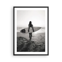 Affisch i svart ram - Kvinna med surfbräda på stranden vid solnedgången - 50x70cm - Havsvågens dotter - Modern väggdekoration för vardagsrum och sovrum ARTTOR