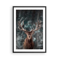 Affisch i svart ram - Porträtt av en hjort med imponerande horn mot bakgrund av en vinterskog - 50x70cm - Krönt skogens kung - Modern väggdekoration för vardagsrum och sovrum ARTTOR