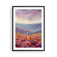 Affisch i svart ram - Ett lavendelfält med en kvinna i hatt mot en bergsbakgrund. - 50x70cm - I lavendelsvärld - Modern väggdekoration för vardagsrum och sovrum ARTTOR