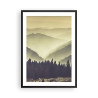 Affisch i svart ram - Dimmigt panorama över berg med skog - 50x70cm - Bortom bergen... - Modern väggdekoration för vardagsrum och sovrum ARTTOR