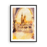 Affisch i svart ram - En akvarell som föreställer Krakows marknadstorg i solnedgången. - 50x70cm - Gryning över marknaden i Kraków - Modern väggdekoration för vardagsrum och sovrum ARTTOR