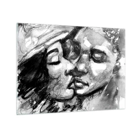 Glastavla - Bild på glas - Svartvit skiss av en öm kyss - 70x50cm - Ett ömt ögonblick - Modern väggdekoration för vardagsrum och sovrum ARTTOR