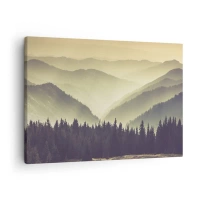 Canvastavla - Bild på duk - Pittoreska bergskedjor höljda i dimma i varmt ljus - 70x50cm - Bortom bergen... - Modern väggdekoration för vardagsrum och sovrum ARTTOR
