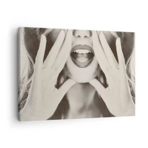Canvastavla - Bild på duk - Svartvitt porträtt av en kvinna med uttrycksfulla läppar och händer - 70x50cm - Jag kommer! - Modern väggdekoration för vardagsrum och sovrum ARTTOR