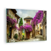 Glastavla - Bild på glas - En pittoresk gata med krukväxter - 70x50cm - I blommornas flod - Modern väggdekoration för vardagsrum och sovrum ARTTOR