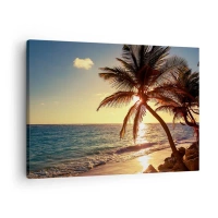 Canvastavla - Bild på duk - Tropisk solnedgång över en strand med palmer - 70x50cm - Sommar under palmträden - Modern väggdekoration för vardagsrum och sovrum ARTTOR