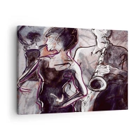 Canvastavla - Bild på duk - Abstrakt jazzscen med en saxofonist och en dansande kvinna. - 70x50cm - Driva iväg i musiken - Modern väggdekoration för vardagsrum och sovrum ARTTOR
