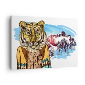 Canvastavla - Bild på duk - En tiger i en kappa mot ett bergslandskap - 70x50cm - Inte lika vild som den tecknas - Modern väggdekoration för vardagsrum och sovrum ARTTOR