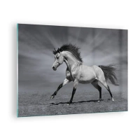 Glastavla - Bild på glas - Ett svartvitt foto av en häst som galopperar på ett öppet fält. - 70x50cm - Född för att förtjusa - Modern väggdekoration för vardagsrum och sovrum ARTTOR