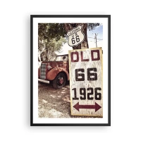 Affisch i svart ram - Veteranbil vid Route 66-skylten - 50x70cm - Amerikanska provinsens legend - Modern väggdekoration för vardagsrum och sovrum ARTTOR