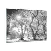 Glastavla - Bild på glas - Svarta och vita olivträd i solljus - 70x50cm - I en olivlund - Modern väggdekoration för vardagsrum och sovrum ARTTOR
