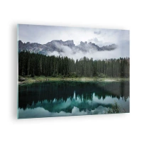 Glastavla - Bild på glas - Berglandskap med en sjö och skog som speglas i vattnet - 70x50cm - Tyst, tyst, väck inte sovande vatten... - Modern väggdekoration för vardagsrum och sovrum ARTTOR