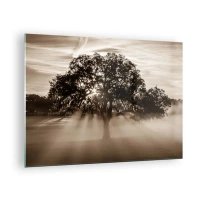 Glastavla - Bild på glas - Ett träd i morgondimman med solstrålar som lyser genom grenarna - 70x50cm - Trädet för kunskap om endast gott - Modern väggdekoration för vardagsrum och sovrum ARTTOR
