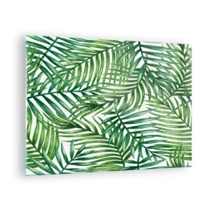 Glastavla - Bild på glas - Gröna palmblad på en vit bakgrund som skapar ett geometriskt mönster - 70x50cm - Under gröna baldakinen - Modern väggdekoration för vardagsrum och sovrum ARTTOR
