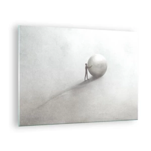 Glastavla - Bild på glas - En minimalistisk silhuett av en man med en stor boll mot en ljus bakgrund. - 70x50cm - Livets spel - Modern väggdekoration för vardagsrum och sovrum ARTTOR