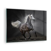 Glastavla - Bild på glas - En galopperande häst mot en mörk bakgrund med en ljuseffekt. - 70x50cm - Grått är vackert - Modern väggdekoration för vardagsrum och sovrum ARTTOR