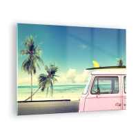 Glastavla - Bild på glas - En strand med palmer och en rosa retroskåpbil vid havet - 70x50cm - Dags att börja semester - Modern väggdekoration för vardagsrum och sovrum ARTTOR