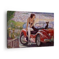 Canvastavla - Bild på duk - En kvinna vid en röd bil med en stad i bakgrunden - 70x50cm - Sommar? Endast på Rivieran - Modern väggdekoration för vardagsrum och sovrum ARTTOR