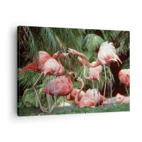 Canvastavla - Bild på duk - En grupp flamingos i en tropisk miljö omgiven av palmer - 70x50cm - Eftermiddags skvaller - Modern väggdekoration för vardagsrum och sovrum ARTTOR