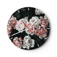 Väggklocka - Klocka på glas - En bukett rosa rosor på en mörk bakgrund - 30x30cm - Rosansamble - Modern väggdekoration för vardagsrum, kök och sovrum ARTTOR