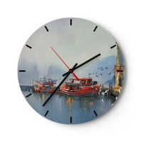 Väggklocka - Klocka på glas - En hamn med röda båtar på lugnt vatten på morgonen - 30x30cm - Världens ände - Modern väggdekoration för vardagsrum, kök och sovrum ARTTOR
